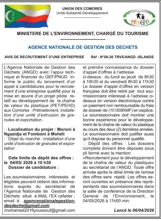 Cet appel s’inscrit dans une dynamique nationale visant à renforcer la gestion durable des déchets plastiques et à promouvoir une économie circulaire aux Comores. Il porte sur la mise en œuvre d’un projet pilote dédié au développement de la chaîne de valeur du plastique, notamment les matériaux PET et PEHD.